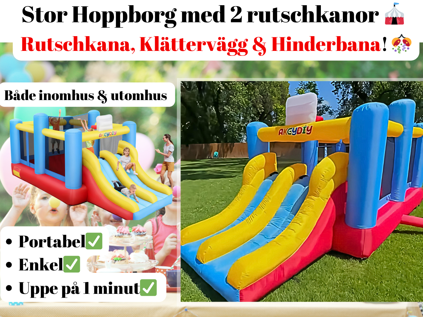 Inget livar upp barnkalaset som en hoppborg. Hoppborgar finns i alla olika storlekar för att passa alla olika tillfällen, i de större får även oftast vuxna hoppa runt. Hyr hoppborg billigt och nära genom Hygglo!