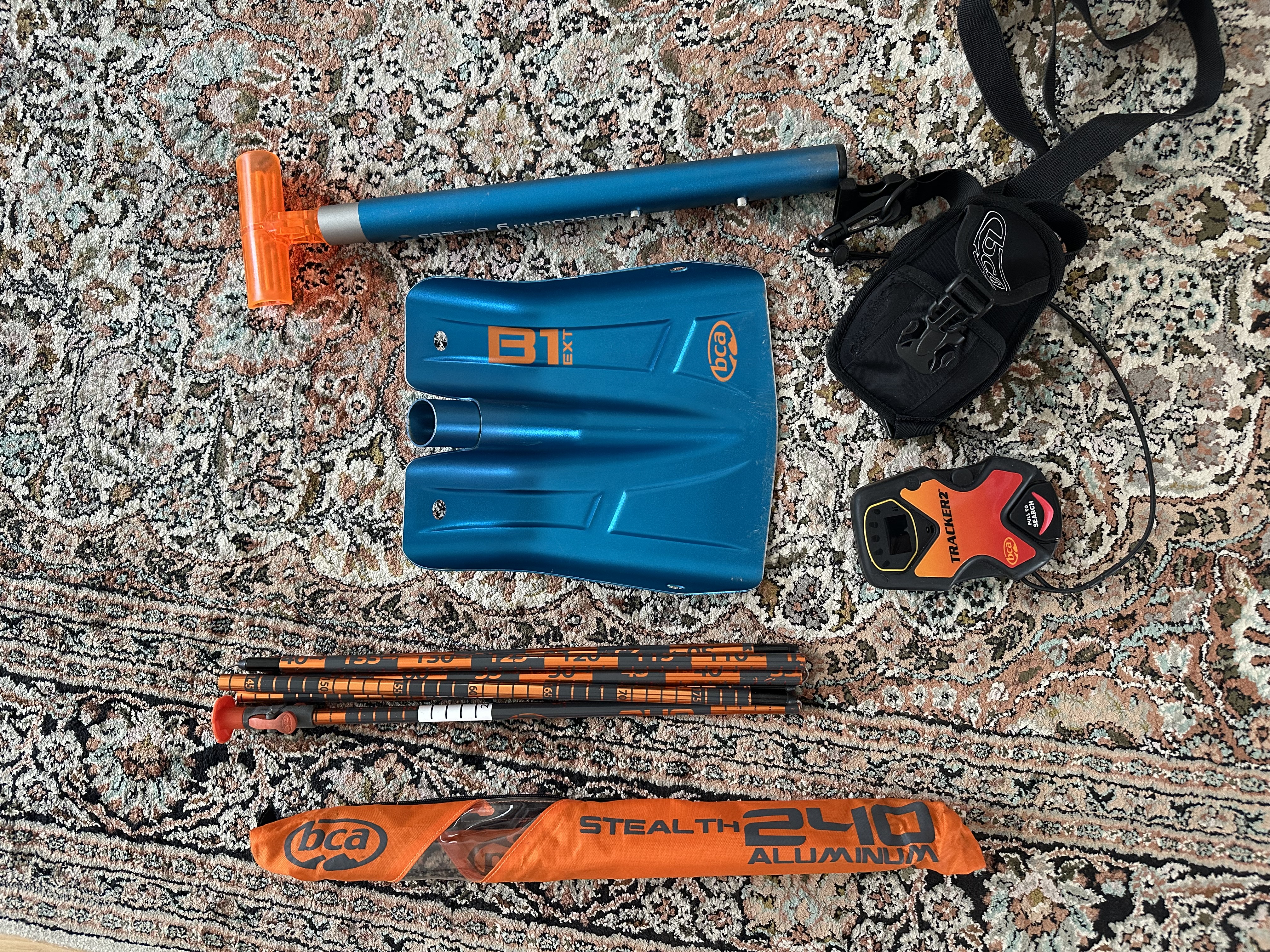 Ett set med utrustning som kan vara bra att ha i lavinområden.