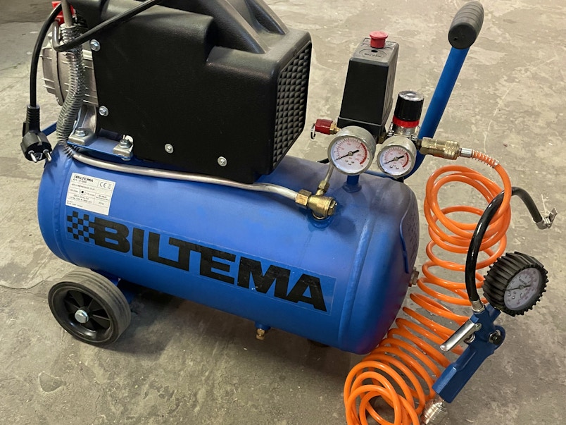 Oljesmord kompressor med 24-literstank. För renblåsning, luftpåfyllning, dyckert- & häftpistol. Vikt 22kg Max 8bar Följer med ett munstycke för däckventil och ett blåsmunstycke. Hämtning och äterlämning sker via svart låda (se bild) med kodlås